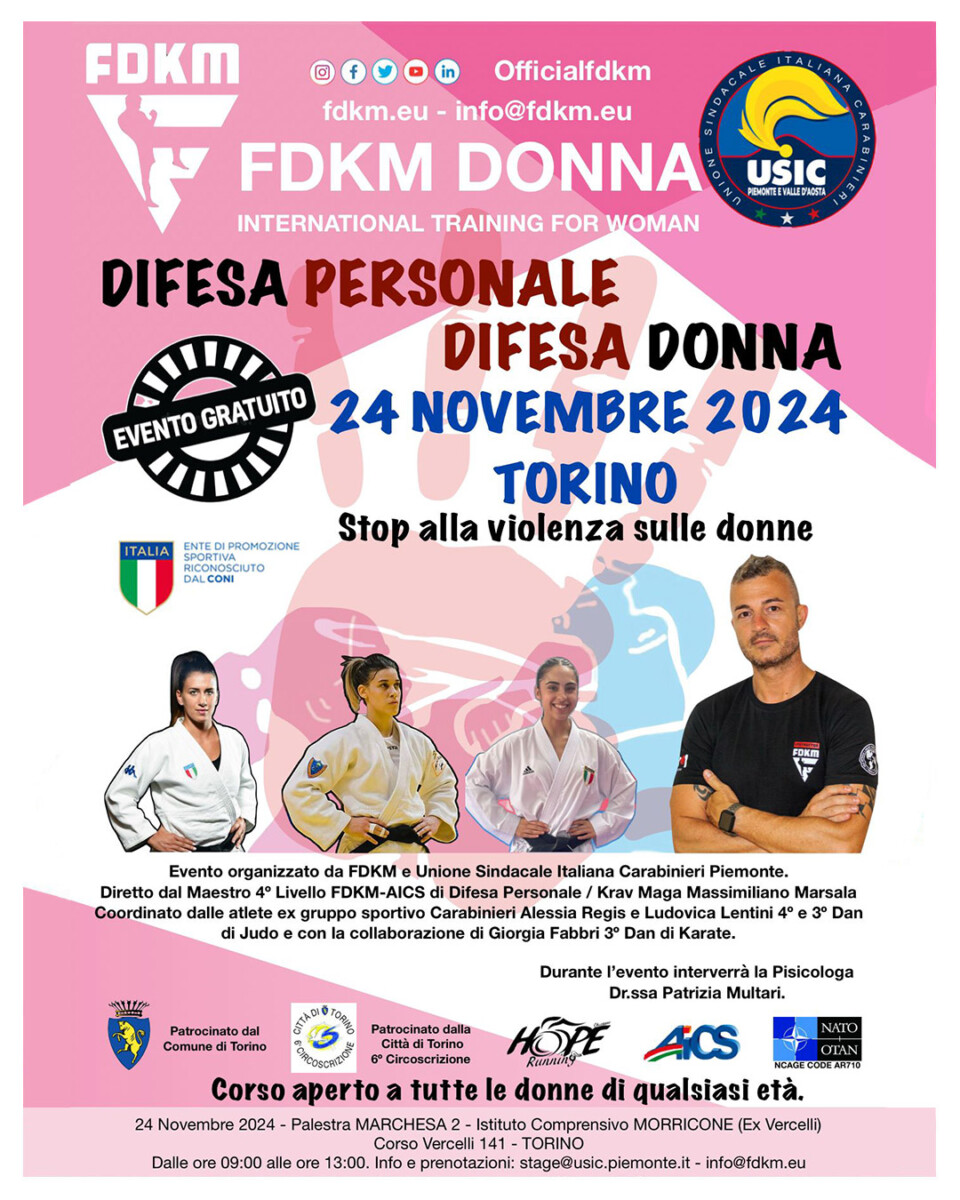 FDKM leader da oltre 10 anni nel settore della difesa personale e nella formazione professionale, organizza un seminario gratuito in occasione della giornata mondiale contro la violenza sulle donne e nell’ambito di un progetto Difesa Donna insieme a USIC (Unione Sindacale Italiana Carabinieri). Il progetto difesa personale difesa donna verrà condotto direttamente dal Presidente FDKM, nonchè Maestro Massimiliano Marsala e coordinato dalle atlete ex gruppo sportivo Carabinieri Alessia Regis e Ludovica Lentini 4° e 3° Dan di Judo e con la collaborazione di Giorgia Fabbri 3° Dan di Karate. Durante l’evento, interverrà la Psicologa e Pisicoterapeuta Dr. Patrizia Multari.